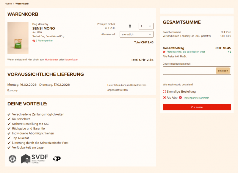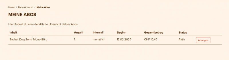 Wäre es nicht angenehm, wenn du die Nahrung für deinen Liebling regelmässig in einem von dir gewählten Rhythmus (monatlich, zweimonatlich usw.) direkt nach Hause geliefert bekommst?